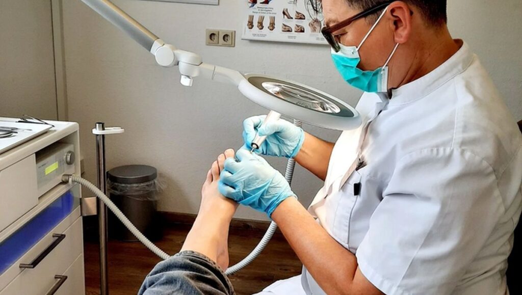 Medizinisch-podologische Behandlung bei Nagelinfektionen durch Bakterien oder Pilze (Onychomykose).